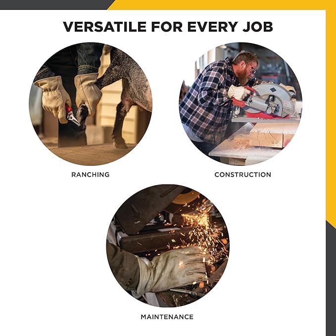 • MAXIMIZE SAFETY AND DURABILITY: Experience the unmatched abrasion and puncture resistance that Wells Lamont Leather Work Gloves offer, crafted from premium 100% grain cowhide leather. Tough jobs in industries like construction, farming, and ranching become safer as these gloves protect your hardworking hands