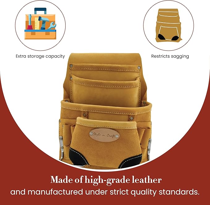• Extra Reinforced: Style n Craft 10-Pocket Carpenter’s Nail & Tool Pouch features contrast black color full-grain leather construction on the main and front pocket corners for extra reinforcement. The leather pouch measures 12" H x 10" W x 2.5" D