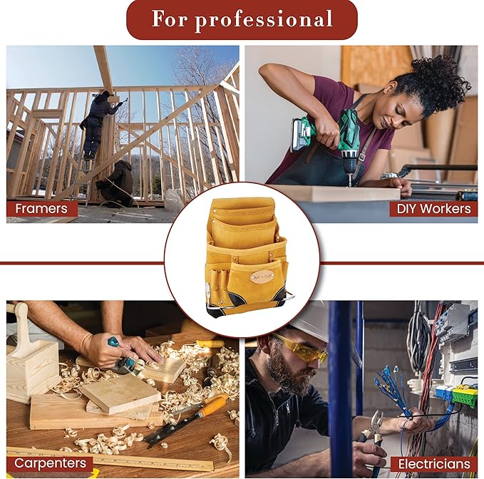 • Leather Pouch: Reinforced with rivet caps and high-quality material, this tool pouch is made with your safety and comfort in mind. Featuring a nickel finish on all hardware, the pouch comes in yellow color with black leather corners at the bottom