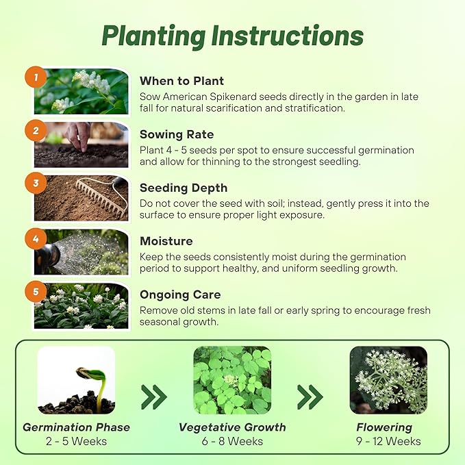 • EASY GERMINATION AND CARE: Although American Spikenard requires seed nicking and stratification for successful germination, it’s relatively easy to care for once established. To start, sow 4-5 seeds per plant with 24-36 inch spacing while pressing lightly under 41F to germinate for 28-72 days for effective growth, allowing our plant to reach its full height and grow year after year.