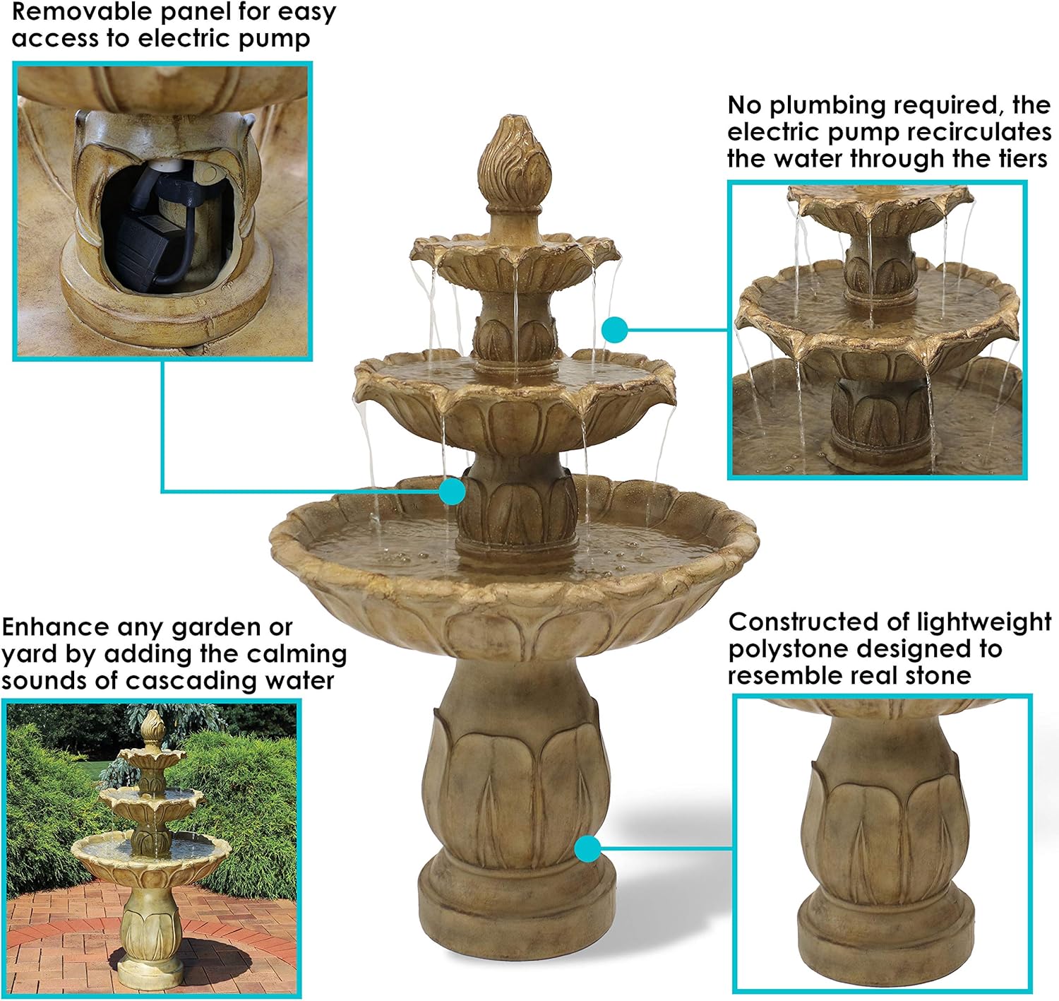 • ELEGANT TIERED DESIGN: This 3-tier tulip patio water fountain adds a graceful focal point to any yard or garden while enhancing visual appeal with its flowing water display. The fountain measures 25" in diameter x 46" H, weighs 40 lbs, and has a water capacity of 4 gallons.