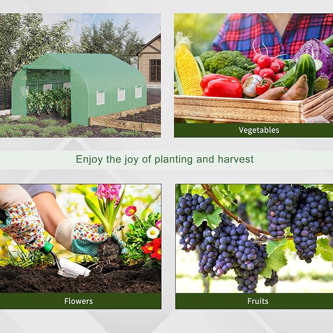 • Heavy-Duty Steel Frame: Our outside greenhouse features a chip-resistant galvanized steel frame with seven rows of reinforcing tubes, a crossbar, and four slant bracing tubes, each featuring a 0.94" thick diameter. Note: Please remove the cover in case of heavy snow, strong wind, and heavy rain.