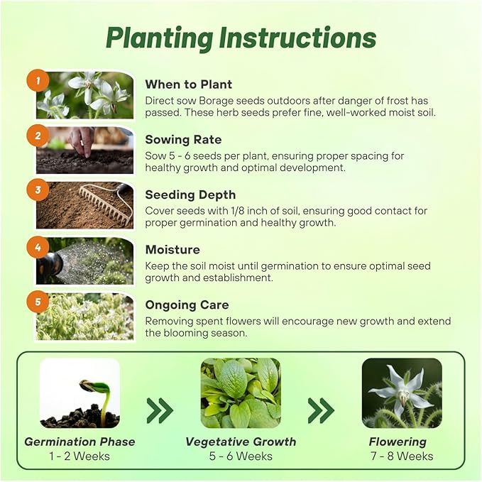• LOW MAINTENANCE & SELF-SOWING: Borage is simple to grow and requires minimal maintenance once established. It is a self-sowing herb, meaning it will naturally reseed each year, ensuring continuous growth and beauty in your garden with little effort on your part. Perfect for gardeners seeking lasting results.