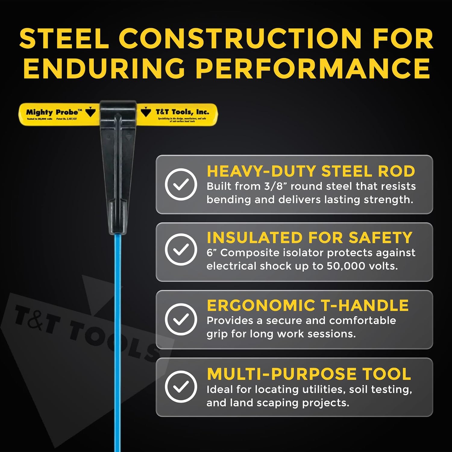 • MULTI-PURPOSE SOIL PROBE: Ideal for a variety of tasks, the T&T Tools Mighty Probe excels in locating septic tanks, underground pipes, and buried utility lines. Its versatile design makes it a sturdy tool for soil testing, landscaping, and other outdoor projects.