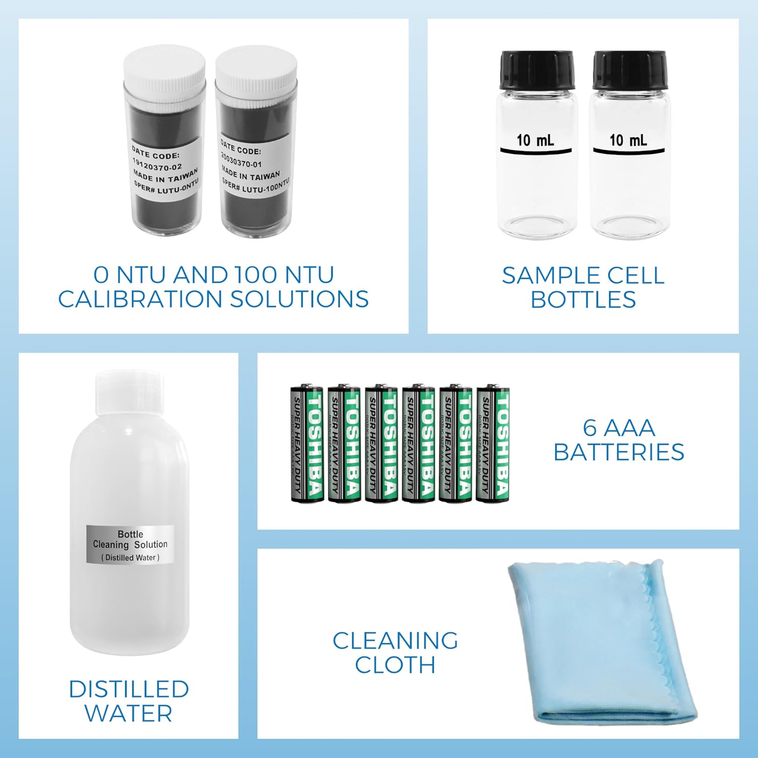 • CARRY CASE: Includes calibration solutions for 0 NTU and 100 NTU, sample cell bottles, distilled water, and cleaning cloth. With the convenience of additional calibration solution availability, users can rely on this all-inclusive solution for accurate turbidity measurements.