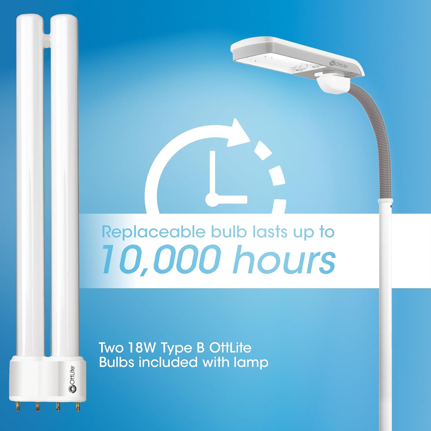 • Long-Lasting Light: This lamp includes two genuine OttLite 18-Watt Type B bulbs, for a total of 36-Watts of power. These bulbs are replaceable, but you won’t have to worry about that for a while — they last up to 10,000 hours. THis makes for a great bright floor lamp for reading chair or office desk!