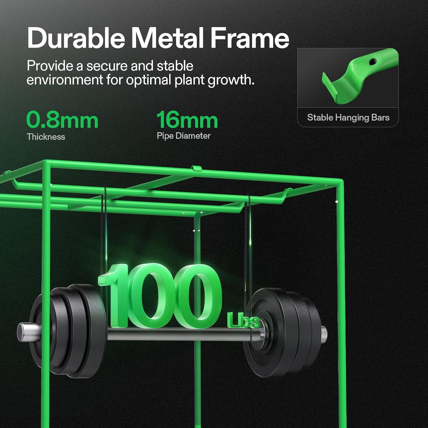 • Sturdy Build & Extra-Thick Materials: The indoor tent features robust metal poles, top bars, and tool-free corner connectors, securing the structure; The top bar supports up to 100 lbs., meeting various equipment needs; Made from premium 340g high-density fabric, the tent is waterproof, tear-resistant, and double-stitched for excellent light blockage; The inside lining designed with PE lining and Mylar walls, ensures a safer environment for your plants