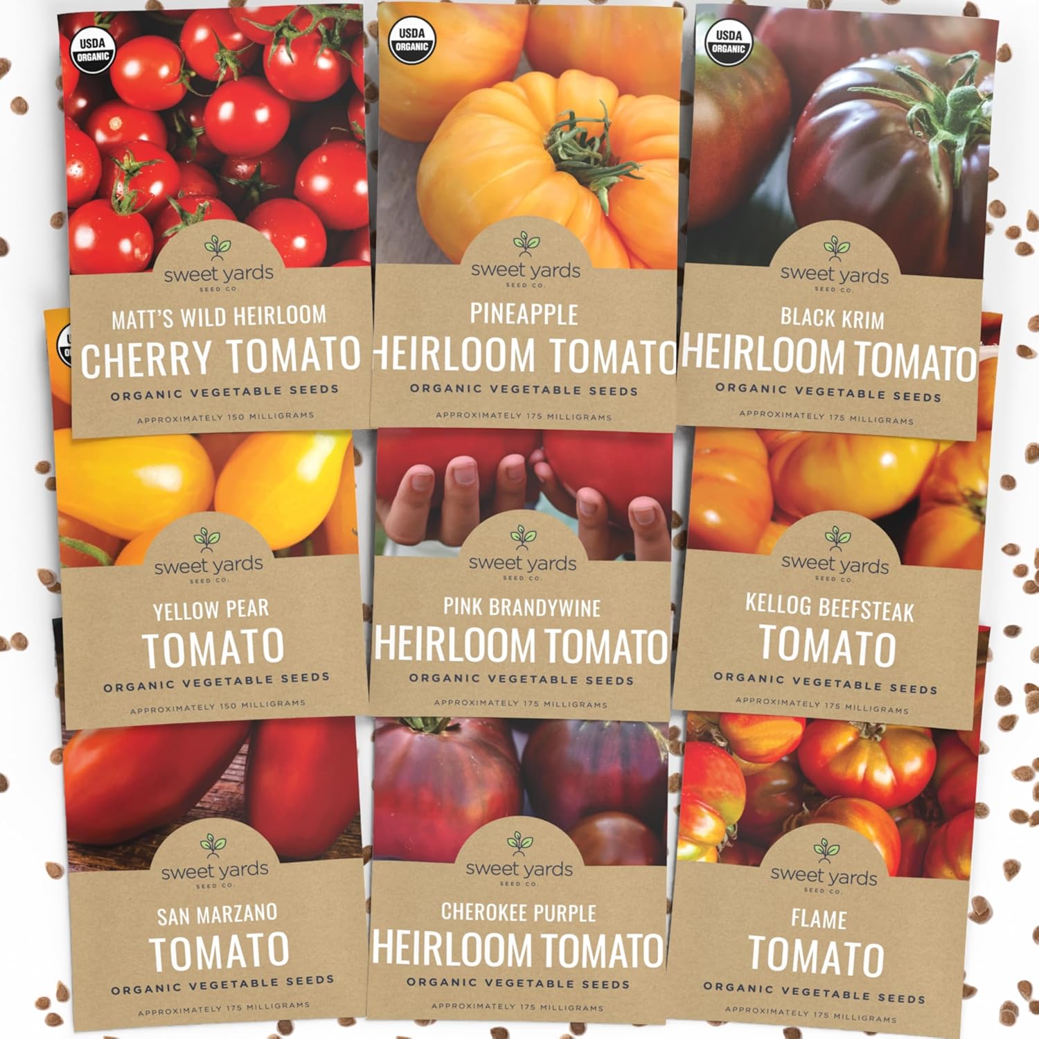 • 9 INDIVIDUAL SEED PACKETS: Kellog Beefsteak Tomato, Black Krim Tomato, Matt's Wild Cherry Tomato, Pink Brandywine Tomato, Roma Tomato, Pineapple Tomato, Yellow Pear Tomato, Cherokee Purple Tomato, Flame Tomato
