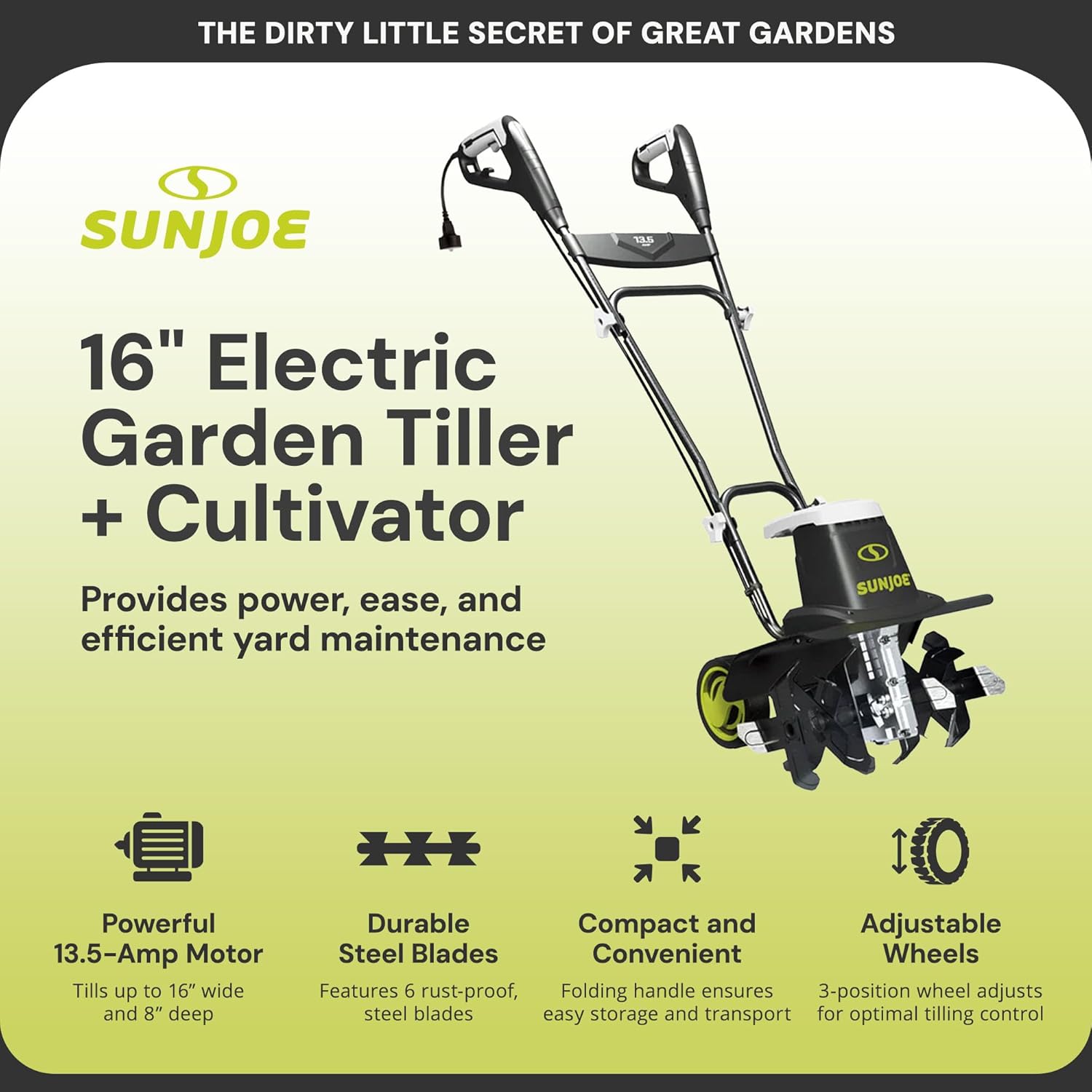 Sun Joe Electric Corded Garden Tiller & Cultivator, Steel Tines, 13.5 Amp, 16 Inch, Black - Heavy Duty Gardening Machine Equipment for Lawn, Yard, & Grass, TJ604E