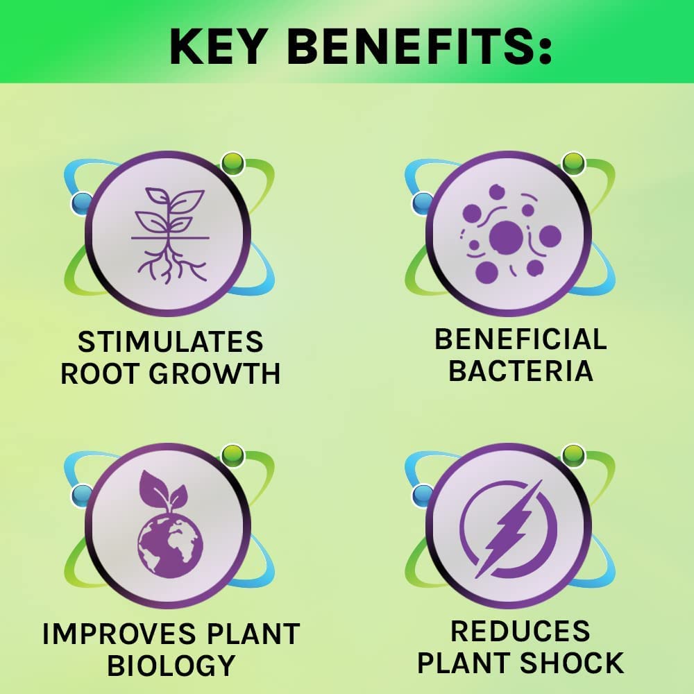• STIMULATES ROOT GROWTH: Supports early root growth, stronger root development, and helps protect roots from pathogens; Creates biofilms to stimulate root growth and fast growth; Protects roots for transplanting and repotting; Good for cloning genetically