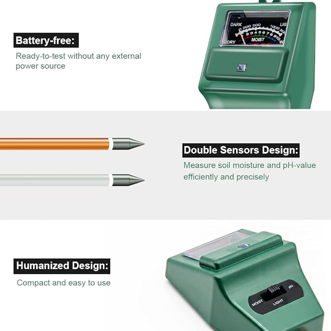 • NO BATTERY NEEDED: Simply insert the meter into soil, wait few minutes, accurate test results will be displayed on the readout panel. No battery is needed.