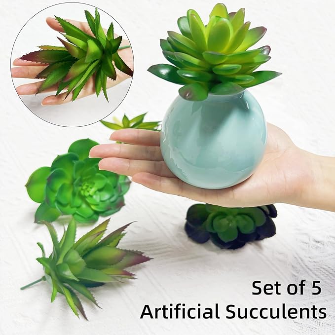 • 5 IN 1 & SIZE – Set of 5 unpotted artificial succulent plant arrangements. These fake succulents plants vary in size from 3.4'' – 4.7'' in length and 2'' – 5'' in length. NOTE: Please confirm the size when selecting