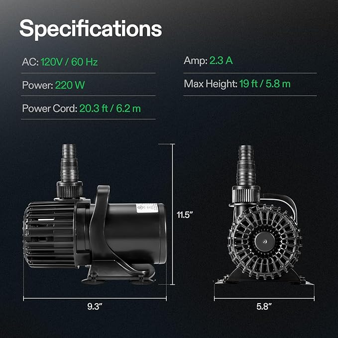 • Energy Saving with Low Noise: Ultra-quiet operation design(30-40db); Less power (220W) consumption with high output (4500GPH/17000LPH) which compared to other pumps; Fits for 720 gallon pond