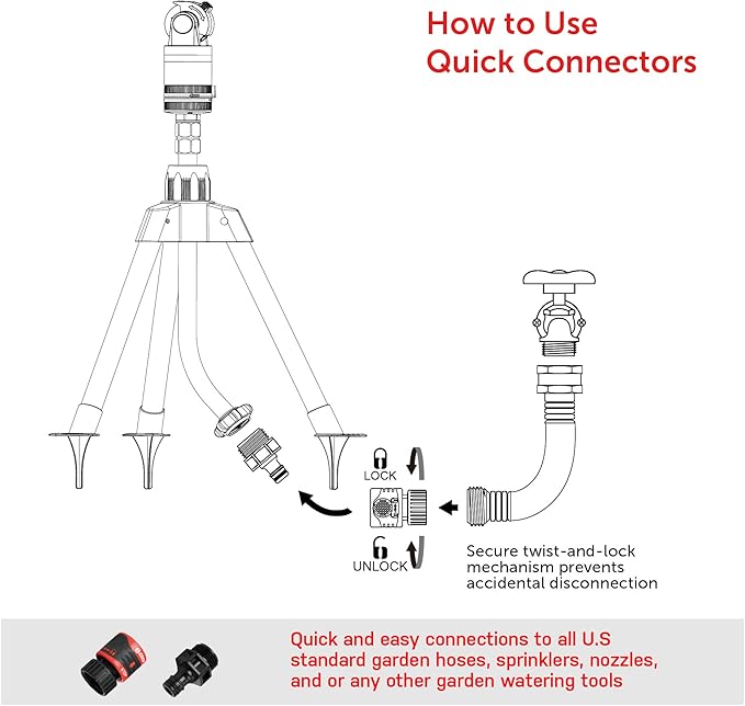 • Quick Connect Starter Kit fits all standard garden hoses and tools. The secure twist-and-lock mechanism prevents accidental disconnection.