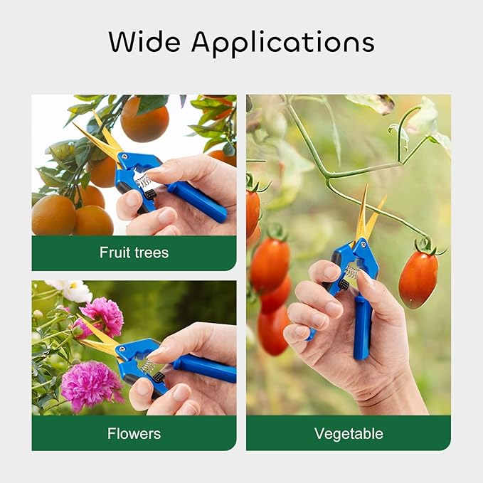 • REDUCE HAND STRAIN -- Pruning shear are built spring-loaded, so that they automatically open which greatly reduces hand fatigue. Ergonomic design rubber grip will make it easy to work for long periods of time without discomfort.