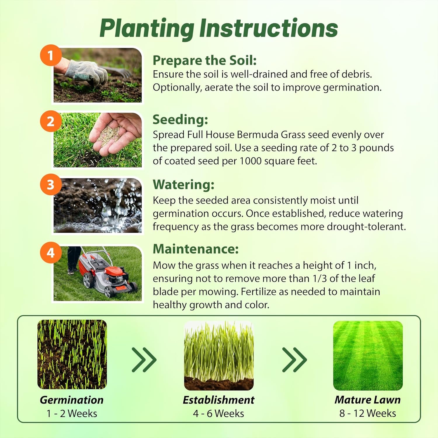 • COATED FOR RELIABLE GROWTH: Our full house Bermuda grass seed blend features coated seeds that retain moisture, encouraging consistent germination and establishment. This feature is essential for creating a dense bermudagrass lawn, perfect for patch repair and fast, reliable growth across all landscapes.