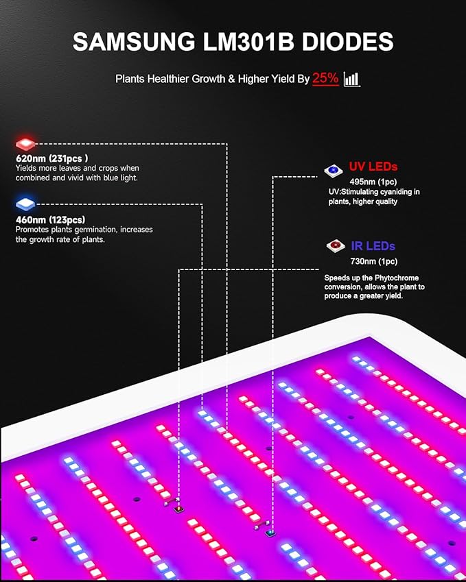• Grow Lights for Indoor Plants Full Spectrum: According to the light compensation point and saturation point of the plant(MJ),the more suitable spectrum of the plant(MJ) was proportioned.Total 360 LEDs included 460nm,620nm,730nm(IR) and 396nm(UV) which can replace natural sunlight.UV diodes stimulate anthocyanins,which improve the quality of fruits and flowers.