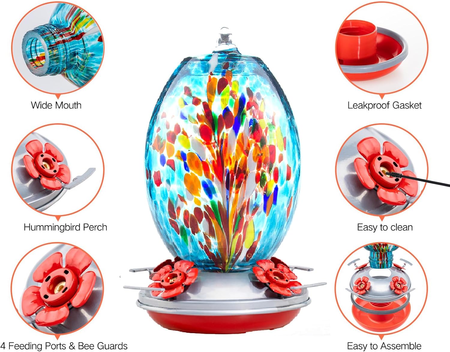 • **Easy to Clean and Refill** This hand-blown glass hummingbird feeder features a wide-mouth top for quick and easy nectar refilling. The detachable base and hand blown glass bottle make cleaning a breeze.