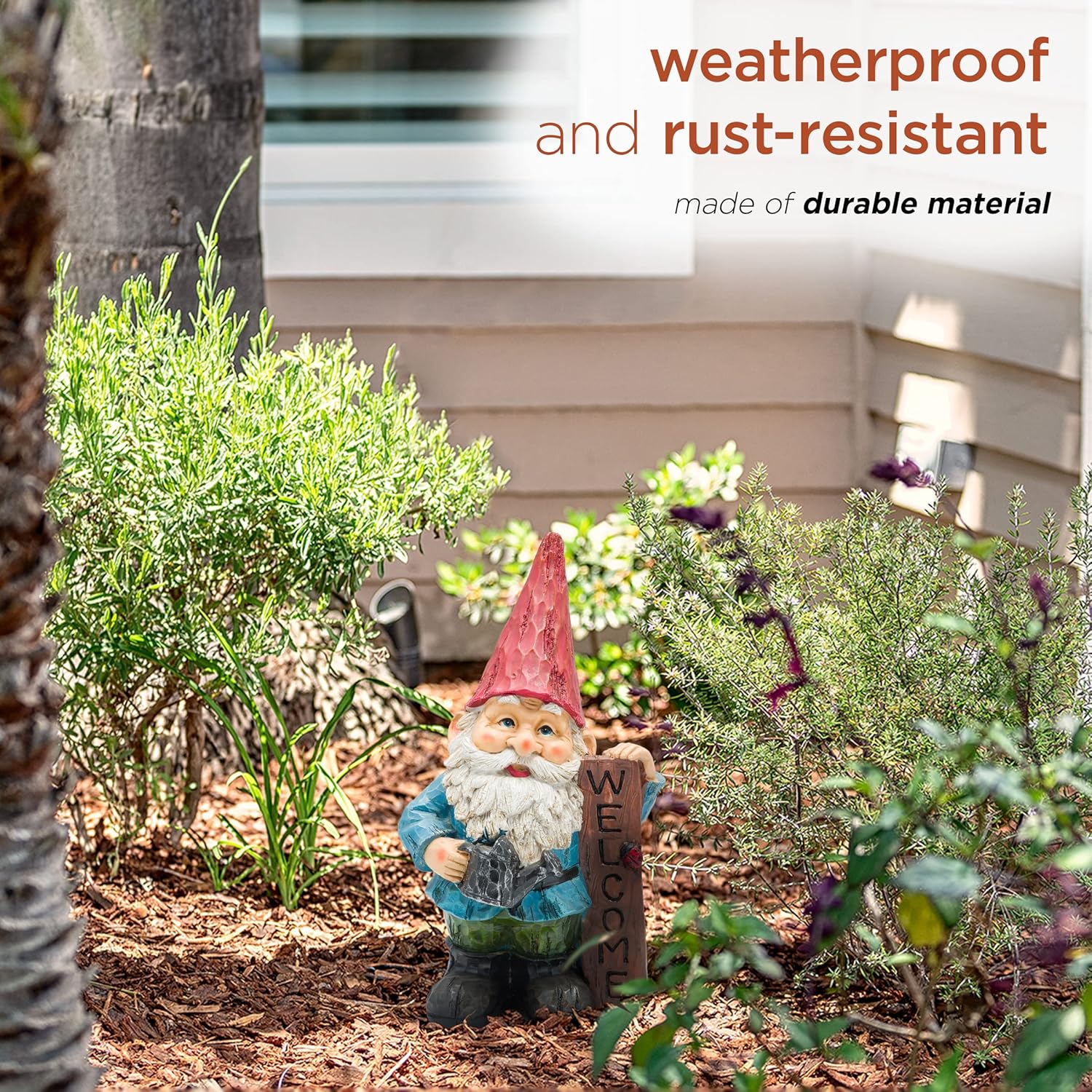 • GARDEN STATUE: Lawn figurine featuring a brightly colored, playful, and magical yard gnome holding a welcome sign, will bring fun and a warm welcome to your front yard, garden, or patio