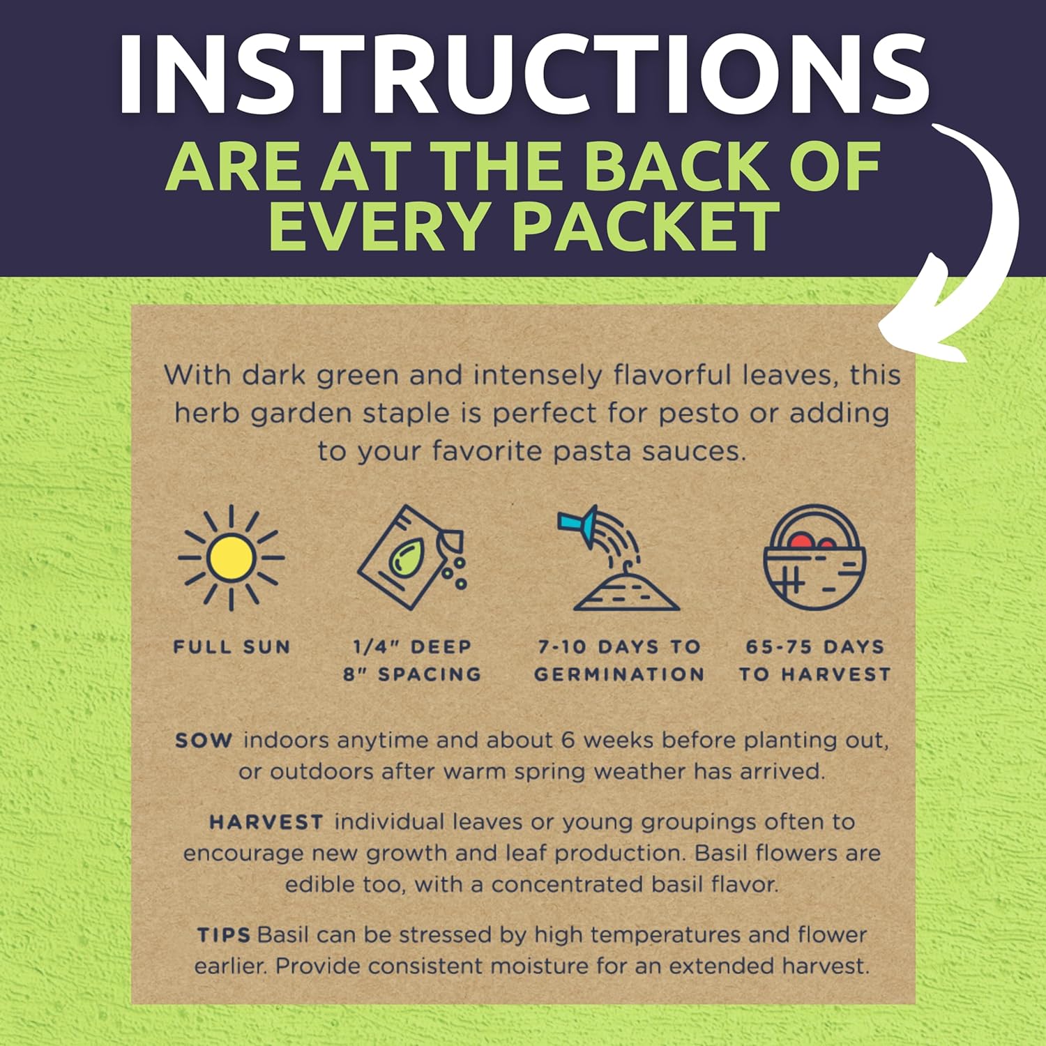 • 8 INDIVIDUAL SEED PACKETS: Cinnamon Basil, Genovese Basil, Greek Basil, Italian Large Leaf Basil, Lemon Basil, Purple Dark Opal Basil, Thai Basil, Tulsi Holy Basil
