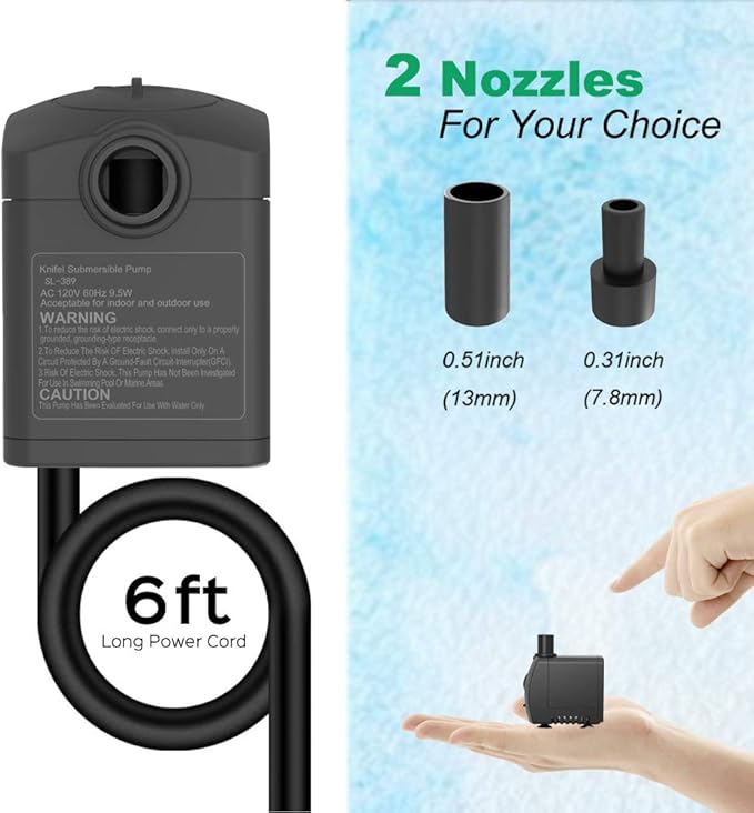 • 【MULTI-OCCASIONS】The fountain pump can make circulation to your tank and give your lovely fish a near-natural environment. This submersible water pump could create water current, ideal for a medium-sized aquarium, small pond, water garden, and desktop water fountains. Perfect for backyard fountain/waterfall, aquarium, ponds, fish tank, tabletop fountains, garden statuary, patio drip irrigation system and hydroponic systems and more.