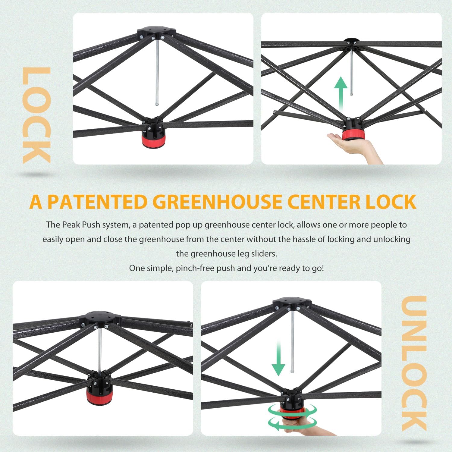 • EASY SETUP: This pop up greenhouse with patented center lock technology supports one person setup in seconds. The pre-assembled frame and innovative Peak Push locking system delivers a quick setup. No tools required. Whether you're a seasoned gardener or just starting out, the EAGLE PEAK pop-up greenhouse for outdoors saves you time and hassle