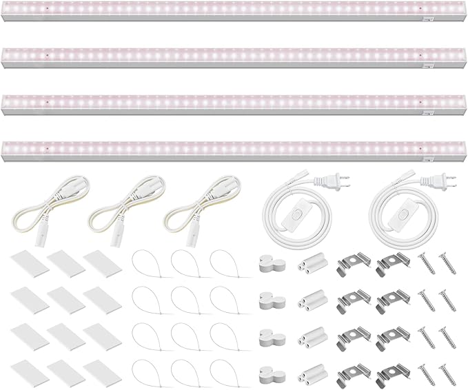 • What You Get: 4 x Barrina T5 Grow Lights, 2 x Power Cords with ON/OFF Switch, 3 x Connecting Cords(20''), 4 x Small Connectors, 8 x Installation Clips, 12 x Double-sided Tapes, 12 x Cable Ties