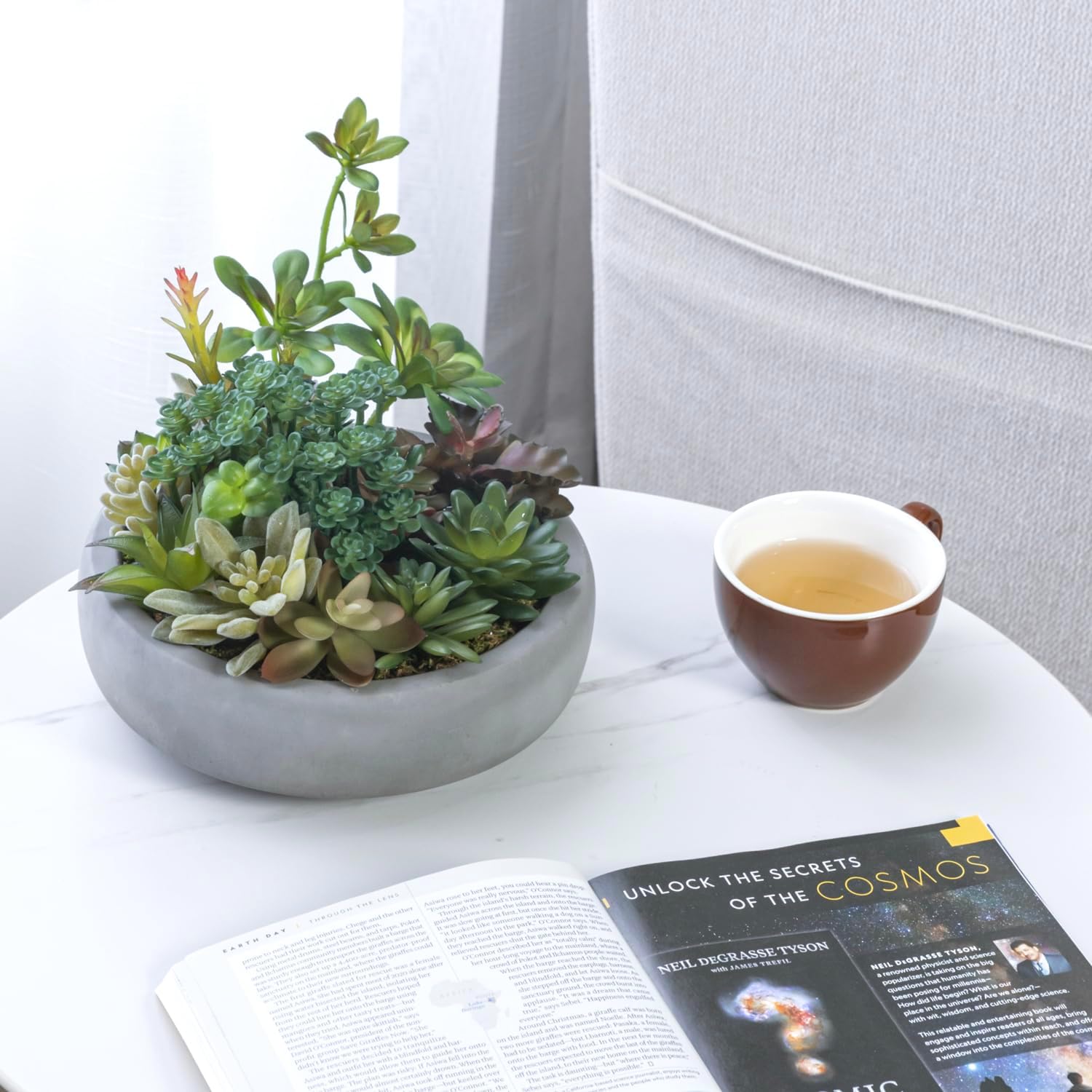 MyGift Assorted Indoor Fake Plants Artificial Succulent Arrangement in Round Gray Cement Planter Pot