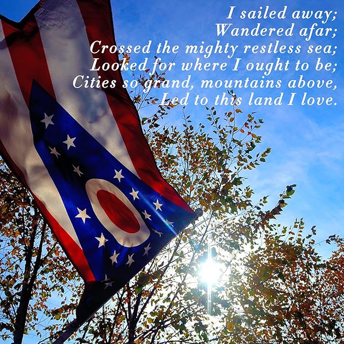 • ★Excellent Gift - The blue triangular field represents Ohio’s hills and valleys. It contains seventeen white stars - thirteen stars surrounding the circle are symbols of the original thirteen colonies. Four stars at the apex of the triangle raise the total number of stars to seventeen The red and white stripes represent the roads and waterways of the state. The white circle with a red center forms an "O" for "Ohio" .This is an old and meaningful flag,a great gift full of meaning.