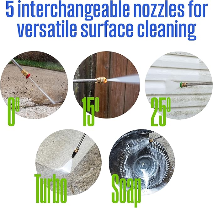 • 2300 max PSI (at initial discharge) and 1900 rated PSI of deep-cleaning water pressure; Up to 1.76 GPM (without nozzle at minimum pressure) and 1.2 rated GPM of water flow; Pro-style steel extendable 17.5” wand with quick-connect nozzles (0°, 15°, 25°, turbo and soap applicator)
