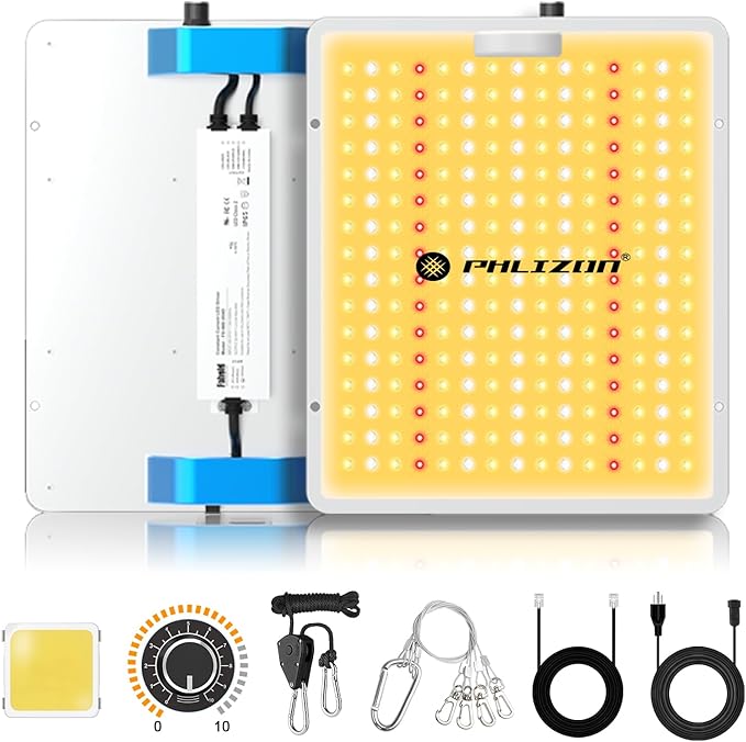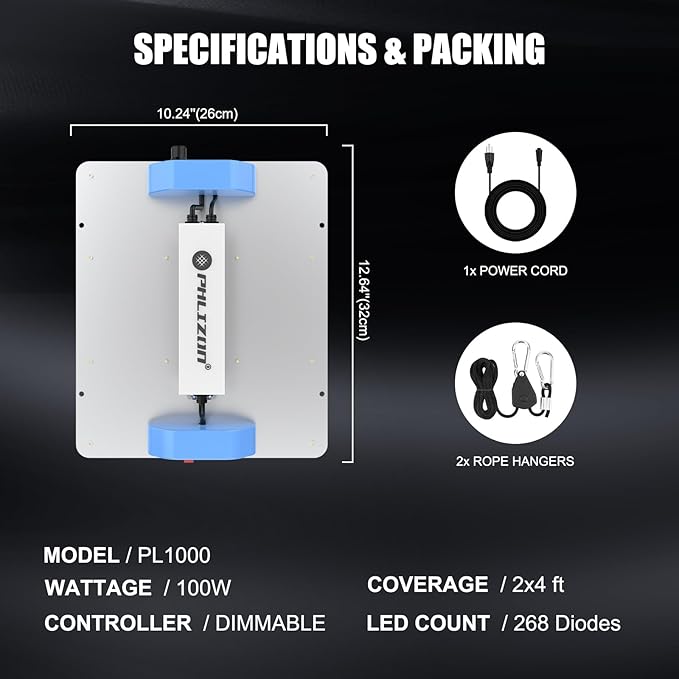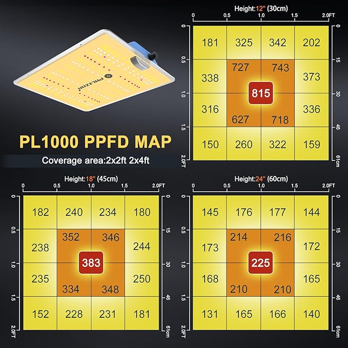 • ENERGY EFFICIENCY-The grow light compares to traditional 1000W HPS/MH while consuming only 100W!, light efficacy is up to 2.8 umol/W, light output PPFD value is 500 umol/m² hanging at 18", grow light is designed to replace tranditional HPS , lower temperature , more scientifically and energy-efficient. making you get 30% higher yield than HPS. Perfect for 2x2ft 3x3ft 2x4ft growing area, higher intensity in a Phlizon mylar grow tent
