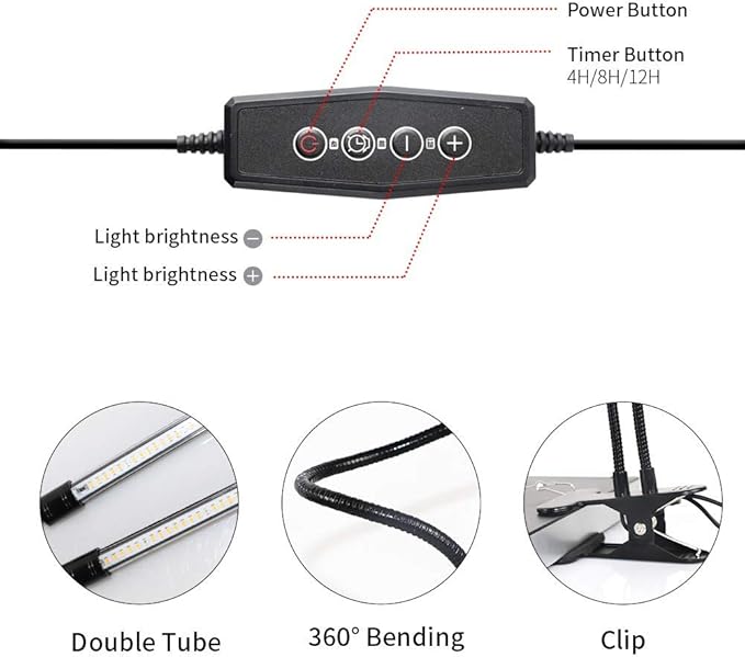 • Easy to Install - with flexible Gooseneck & strong clamp,it allows you to place the growth light in any direction to provide the best lighting angle for your plants,meet the cover around the plant.Powered by USB or AC Power Plug