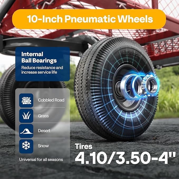 • NOISE REDUCTION TIRES - The load-bearing, shock-absorption, and noise- reduction of the cart are all determined by the casters; The pneumatic tires have good elasticity, impact resistance, and noise reduction; Compared with small wheels, large wheels are able to adapt to various road conditions and have good load carrying advantages; PLEASE BE AWARE that the tires are not fully inflated due to safe transport consideration