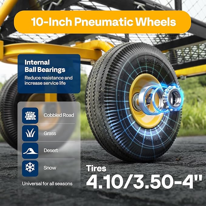 • NOISE REDUCTION TIRES - The load-bearing, shock-absorption, and noise- reduction of the cart are all determined by the casters; The pneumatic tires have good elasticity, impact resistance, and noise reduction; Compared with small wheels, large wheels are able to adapt to various road conditions and have good load carrying advantages; PLEASE BE AWARE that the tires are not fully inflated due to safe transport consideration