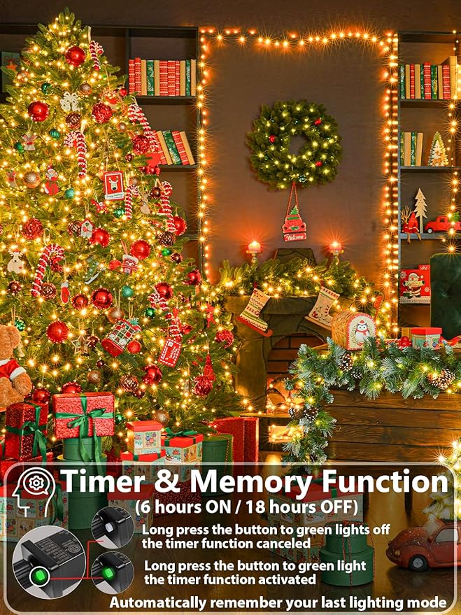 • Timer & Memory: Super bright with upgraded 200 LED bulbs, the twinkle Christmas lights are able to be on for 6 hours or off for 18 hours automatically everyday when timer function activated, and it will remember the last lighting mode with the built-in memory chip. Each light string is total 75.8FT (9.8FT leading wire and 66FT with LED lights).