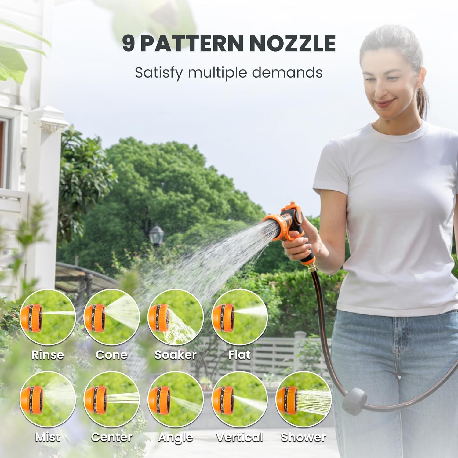 • Multi-function Nozzle: 9 watering patterns nozzle on hose reel can meet your any needs, just leave your flower-watering, car-washing, etc to the nozzle.