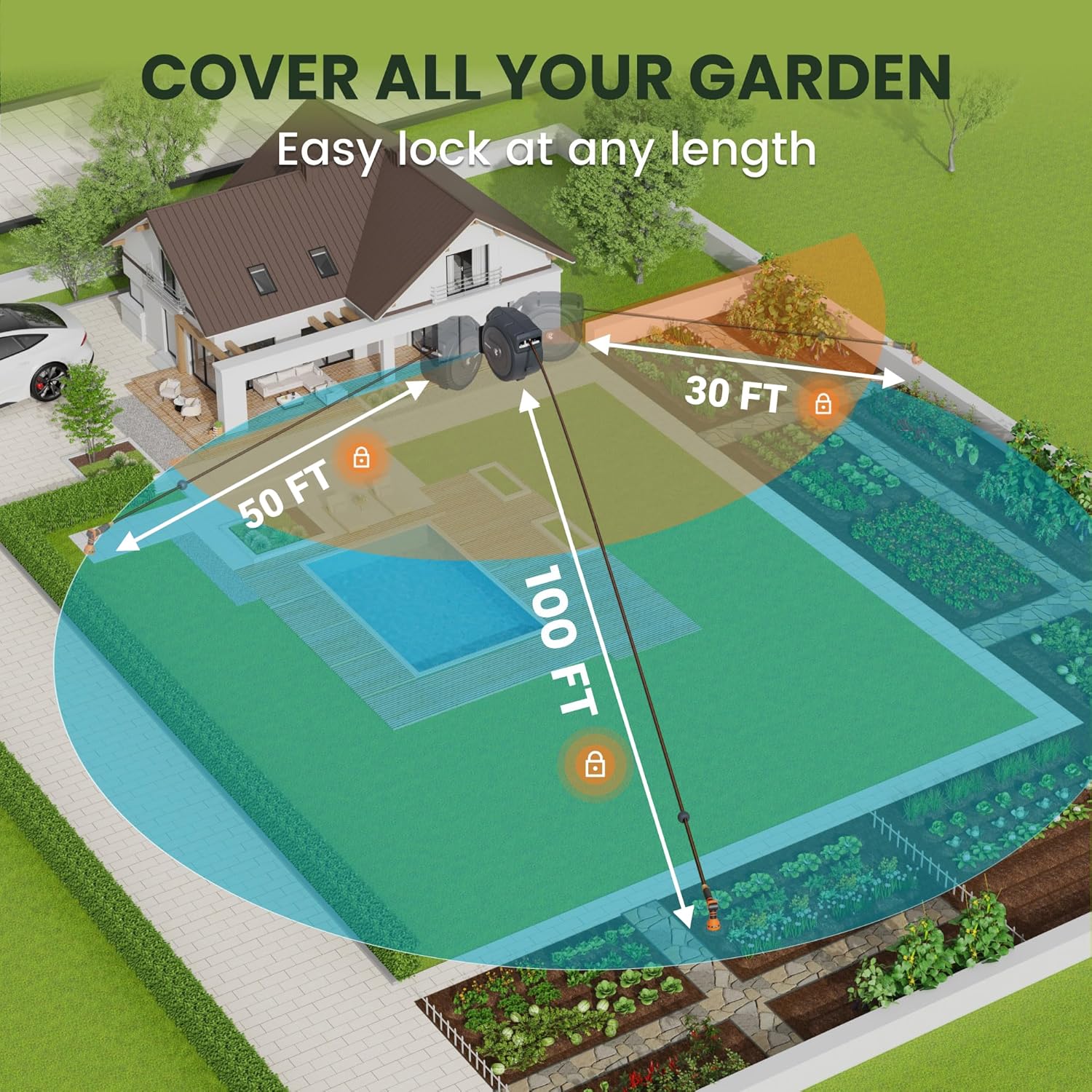 • Robust Lock Mechanism: The Giraffe Tools hose reel has a patented design certified any-lock mechanism that locks at any length, cover every corner of your garden. And specially-designed stop ball can protect hose when it retracts.