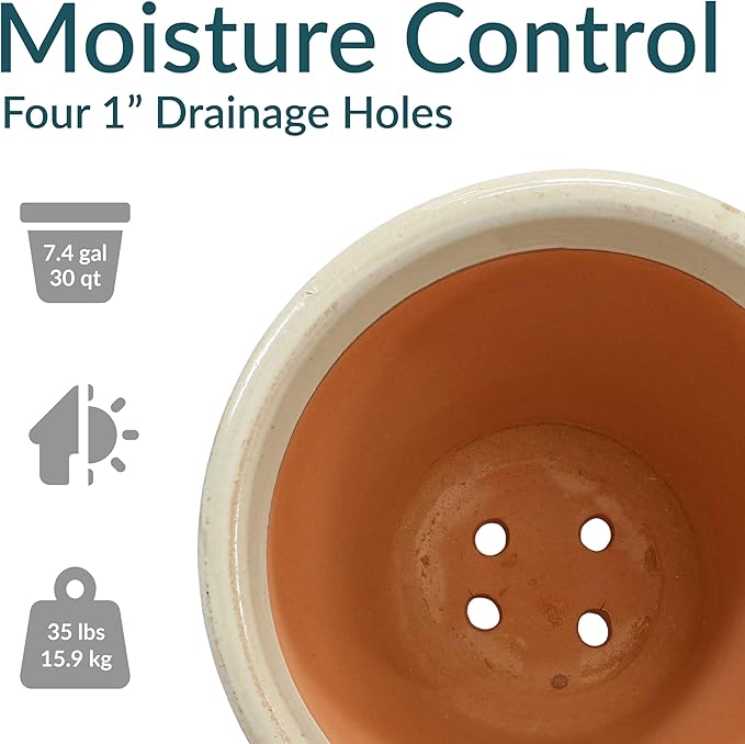 • LARGE SIZE FOR GROWING PLANTS: The large plant pot features a spacious top diameter and 7.4-gallon soil capacity that provides ample space for plants to grow. The planter has a 18.5" outer top diameter (16.5" inner diameter) x 10.5" outer base diameter (8" inner base diameter) x 15" H outer (14" H inner) and weighs 32 lbs.