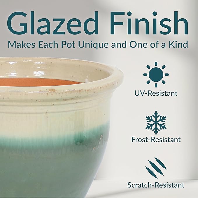 • DESIGNED FOR BEAUTY AND DURABILITY: This outdoor plant pot is crafted with a rich, hand-painted glazed finish that is kiln-fired for a classic, shining appearance. Subtle variations in color highlight the artisanal glazing process, making each piece truly unique. The durable ceramic construction offers natural UV and frost resistance, while its heavy weight adds stability to outdoor arrangements, keeping the planter upright in windy conditions.