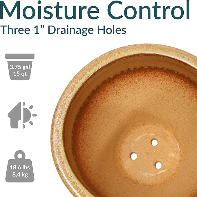 • LARGE SIZE FOR GROWING PLANTS: This large plant pot features a spacious top diameter and 3.75-gallon soil capacity that provides ample space for plants to grow. The planter has a 14.5” outer top diameter (12.75” inner diameter), a 9” outer base diameter (7” inner base diameter), an 11.25” outer H (11” inner H), and weighs 18.6 lbs.