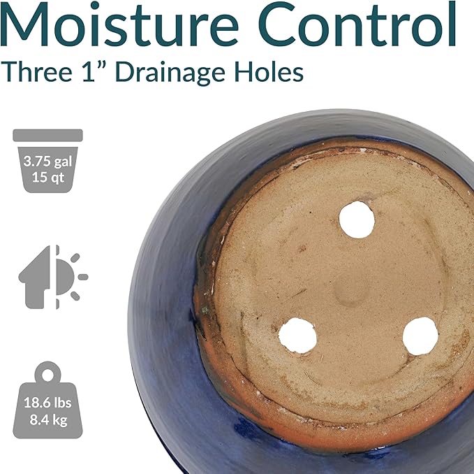 • LARGE SIZE FOR GROWING PLANTS: This large plant pot features a spacious top diameter and 3.75-gallon soil capacity that provides ample space for plants to grow. The planter has a 14.5” outer top diameter (12.75” inner diameter), a 9” outer base diameter (7” inner base diameter), an 11.25” outer H (11” inner H), and weighs 18.6 lbs.