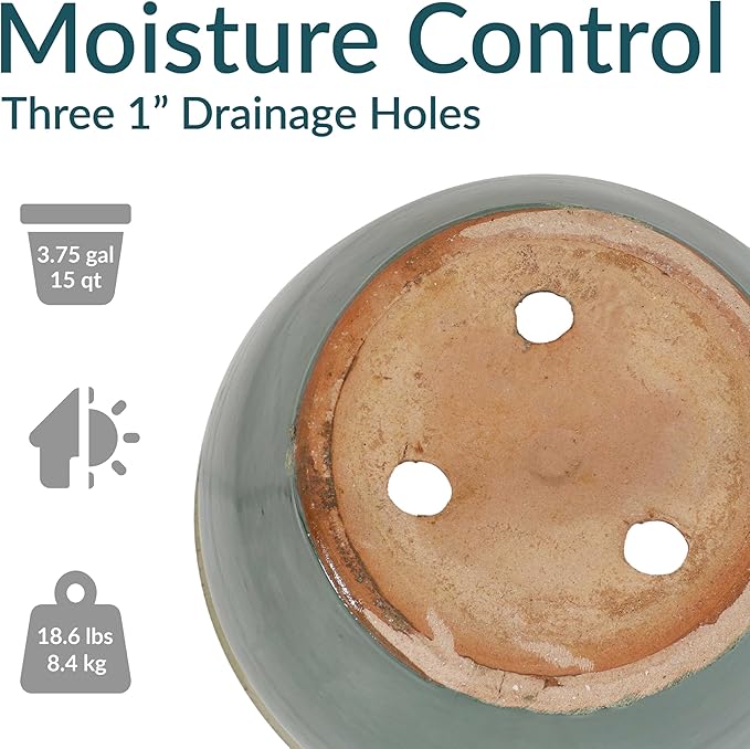• LARGE SIZE FOR GROWING PLANTS: This large plant pot features a spacious top diameter and 3.75-gallon soil capacity that provides ample space for plants to grow. The planter has a 14.5” outer top diameter (12.75” inner diameter), a 9” outer base diameter (7” inner base diameter), an 11.25” outer H (11” inner H), and weighs 18.6 lbs.