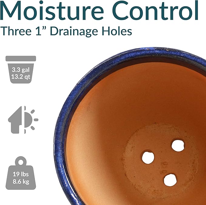 • LARGE SIZE FOR GROWING PLANTS: This large plant pot features a spacious top diameter and 3.3-gallon soil capacity that provides ample space for plants to grow. The planter has a 13.5" outer top diameter (12.25" inner top diameter), a 7.5" outer base diameter (6.25" inner base diameter), an outer height of 12" (11" H inner), and weighs 19 lbs.