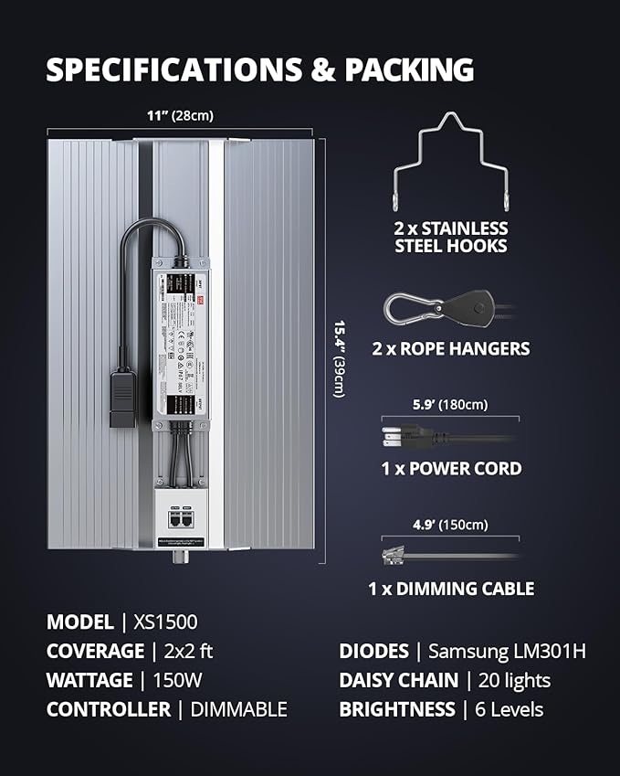 • Low Energy Low Costs: Compared to traditional 250W HPS/MH, XS1500 plant lights for indoor growing draws only 150W, boosts yields by 30% and cuts running costs; perfect for 3x3 ft veg & 2x2 ft flowering; adjust the height & brightness to suit plants' needs
