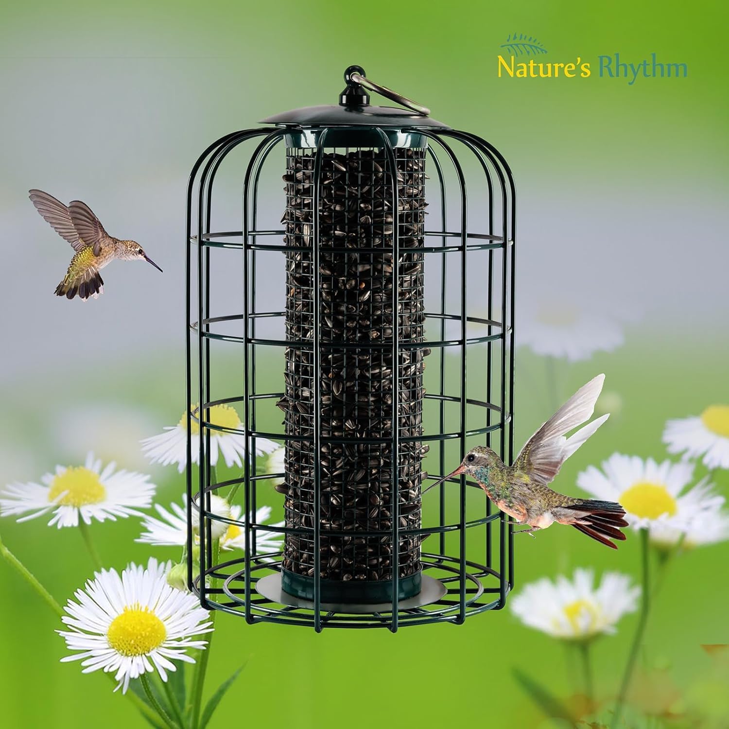 Nature's Rhythm Outdoor Hanging Bird Feeder Cage Mesh Tube Squirrel Proof Wild Bird Feeder with Large Metal Seed Guard Deterrent