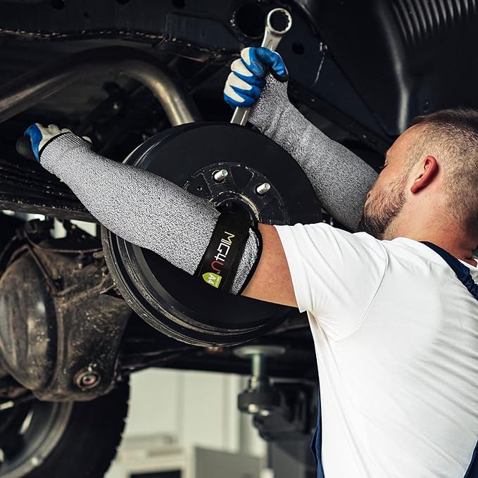 • Highly elastic cut resistant sleeves with a velcro strap at the top can adjust tighten to fit your upper arm/bicep ensures it won't slip down, completely holds the sleeve in place for maximum protection