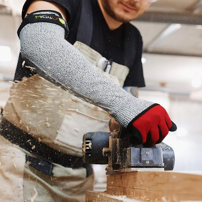 • Highly elastic cut resistant sleeves with a velcro strap at the top can adjust tighten to fit your upper arm/bicep ensures it won't slip down, completely holds the sleeve in place for maximum protection