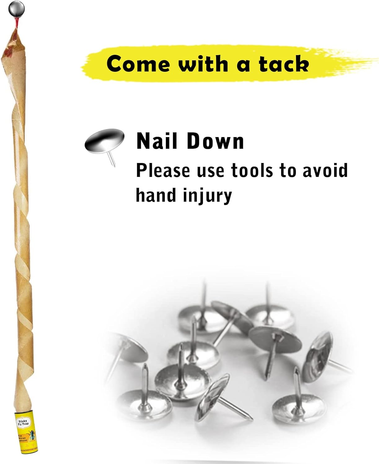 • Notice: when the weather gets hot, the gel of the fly strips melts, the yellow hanging string can be easily pulled off. We suggest you prepare a rope and a pair of scissors, when a small amount of sticky paper is pulled out, poke a hole in the paper with a pair of scissors and tie your rope, at last, pull the rest out cord slowly while turning tune in a counterclockwise motion. Or nail the sticky fly paper directly to the wall. It's easier to refrigerate for a while before using it!