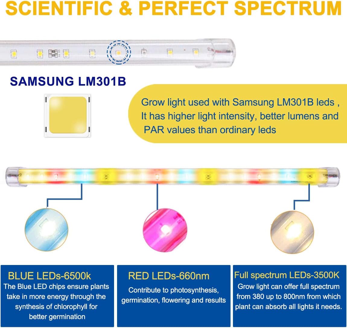 • 【Sunlight Full Spectrum】LED Grow Lights utilize the latest in high energy efficiency diodes and excellent spectrum design: these diodes delivers powerful light output and wave from 380nm~800nm full spectrum just like natural sunlight, suit for all plants whole stages indoor growing.760nm red light promotes photosynthesis, germination, bloom and fruit bearing. 6500K blue light ensures the plants take in more energy through chlorophyll synthesis to help in germination.