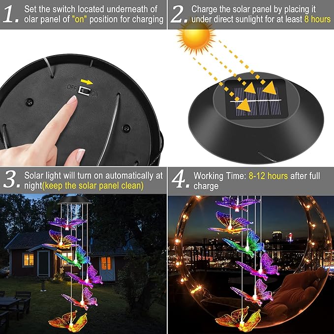 • ๐Ÿฆ‹ใ€SOLAR POWERใ€‘The solar panel stores natural energy to illuminate the Butterfly without electricity. Our outdoor wind chime light is the waterproof and durable, great for hanging up at your garden or patio.Easy to use and convenient to hang up, no wire or USB needed. No maintenance required. Simply let nature power the Butterfly Wind Chimes. And if you like environment friendly product, this is the one for you!
